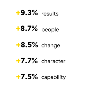 Results: A leader’s ability to plan and organize, set standards, drive energy, and hold themselves accountable for achieving results.