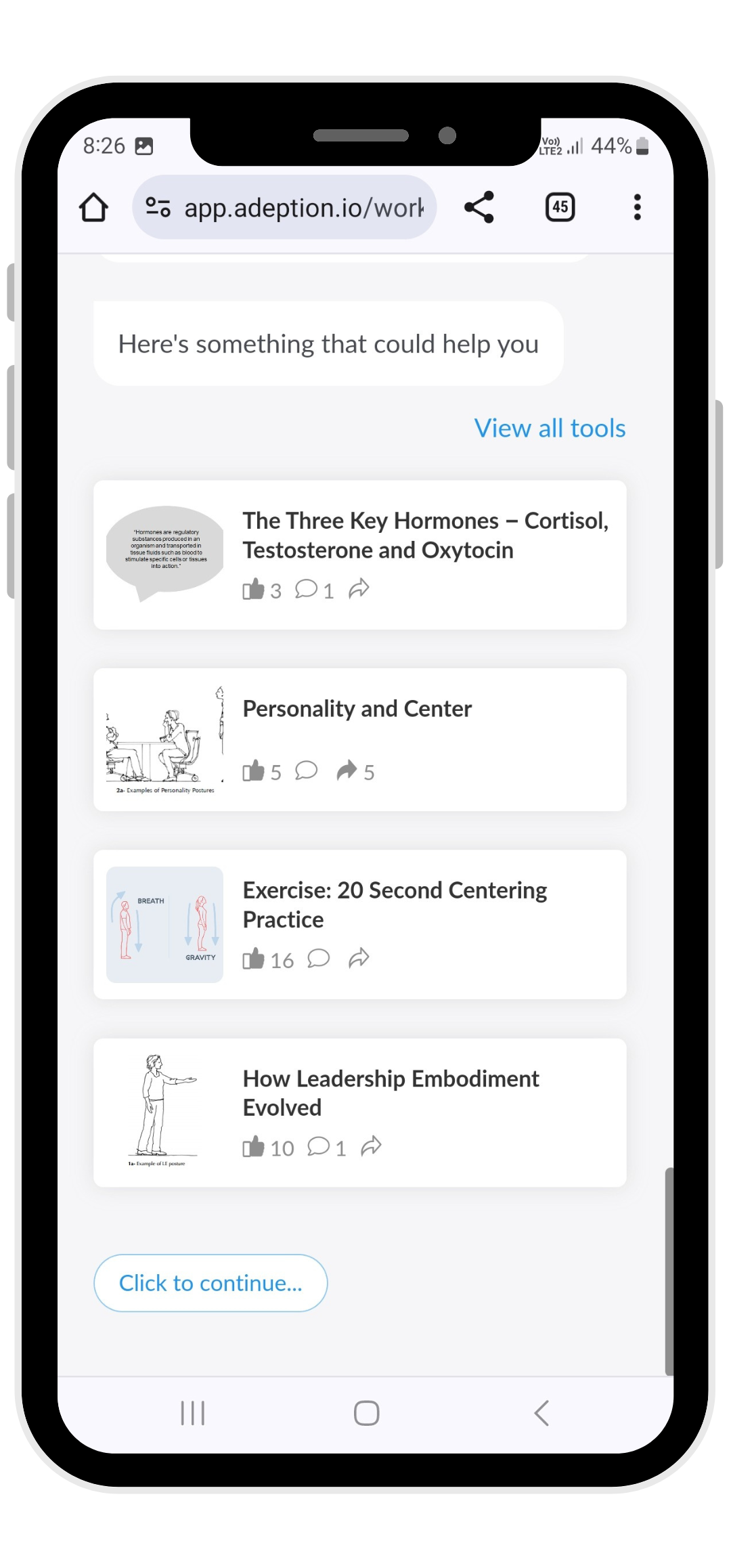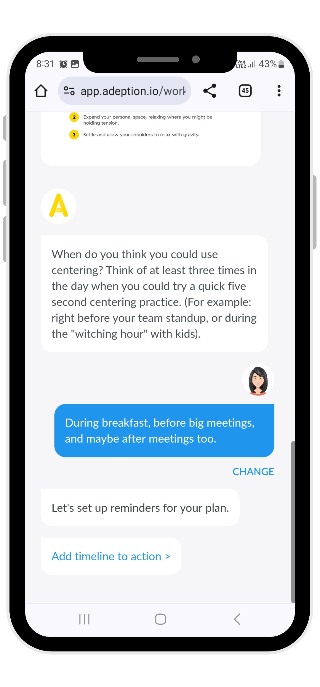 The library of ready-to-go digital workouts mix and match to the needs and challenges that leaders are facing in the moment. Each 15 minute workout uses the conversational interface in the platform to step a leader through the Adeption B3 methodology – just like a ‘real life’ coach would. This respects the context leaders are coming from and operating in; giving them the space to contextualize and focus on what they need. Each conversation prompts reflection, provides tools and insights from others who have faced similar challenges, and helps people to take action on the job.